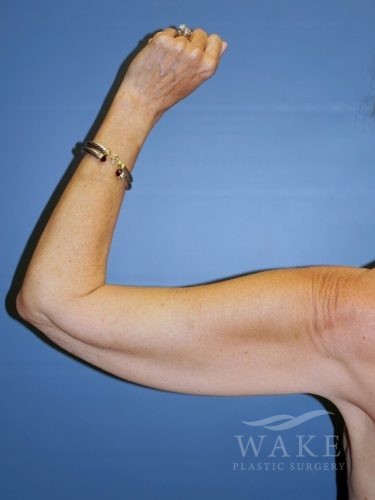 This patient lost about 120 lbs after gastric bypass surgery. She was unhappy with the skin laxity of her upper arms. I completed a liposuction assisted brachioplasty. She is seen here 7 months after surgery. She has an anterior scar that can be seen with arms open but which is obscured when the arms are at the side.